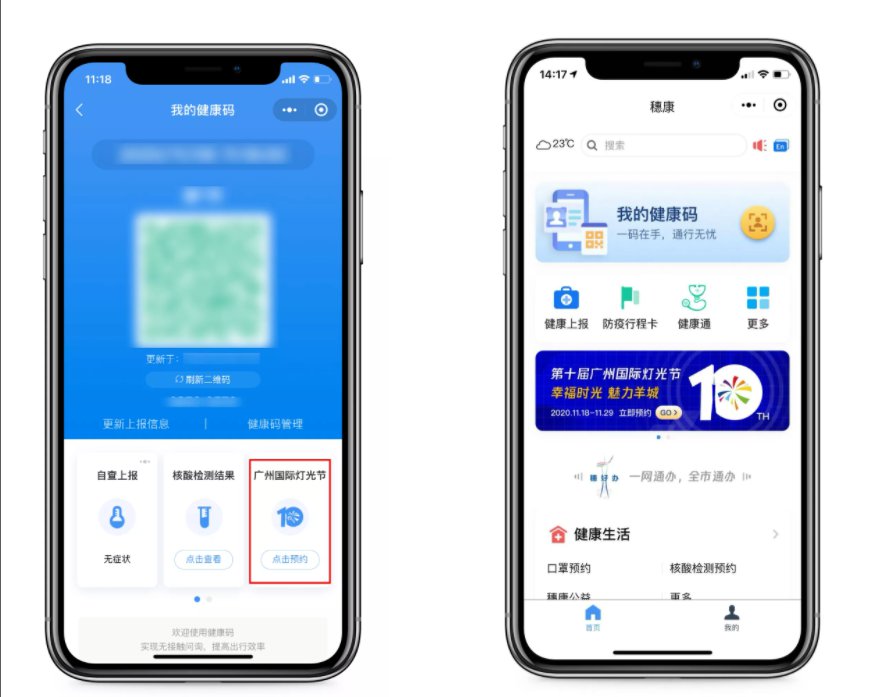 “穗好办”在“穗康”小程序开放预约入口,打开“穗康”小程序,登录并进行健康上报,更新“穗康码”,点击“穗康码”下方“广州国际灯光节”预约,或点击“穗康”小程序首页灯光节banner进入预约。