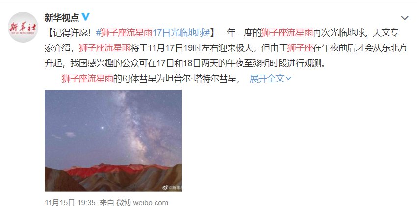 2020狮子座流星雨17日19时迎来极大(2020.11.17狮子座流星雨)