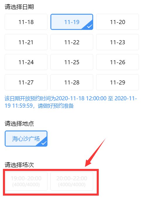 目前11月29日前预约已满额,11月27日10点后可预约11月30日场次,11月28日10点后可预约12月1日场次,每天开放两场,每场名额8000个。