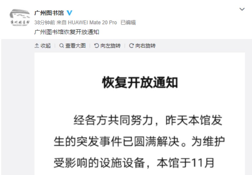 广州图书馆刚刚在官方微博上发布公告称:11月12日在广州图书馆发生的突发事件已圆满解决,为维护受到影响的设施设备,广州图书馆于13日继续实施临时闭馆措施,14日起恢复正常开放。馆方同时在公告中呼吁大家珍惜生命,共同维护公共秩序。