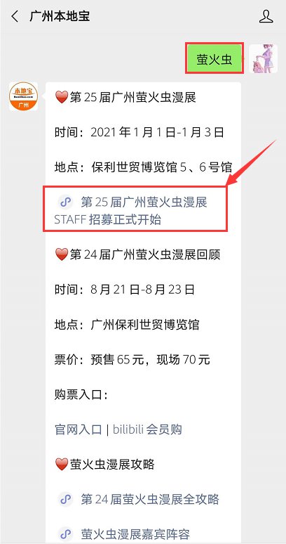 小编提醒:搜索关注广州本地宝(ID:bdbguangzhou)微信公众号,在对话框回复【萤火虫】,即可获得第25届广州萤火虫STAFF招募报名入口、最新资讯,还可以获得往期萤火虫漫展嘉宾阵容、入场须知、场馆地图、交通指引、舞台时间表等相关信息!更多相关信息正在持续更新中,敬请期待!
