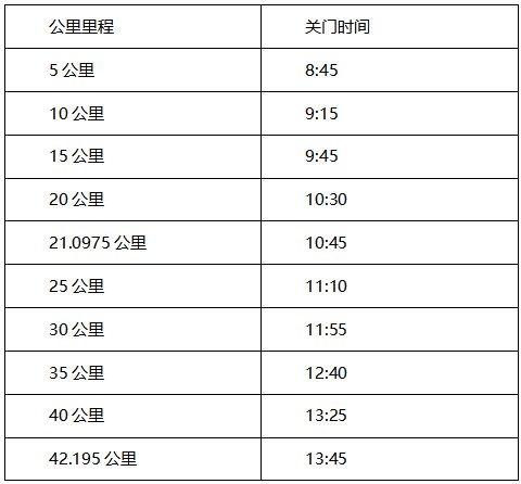 为了保证参赛选手比赛安全,限时对社会交通进行滚动封闭。比赛路线各段专设了赛时关门时间,关门时间之后,相应公里点的计时毯停止工作,相应路段将恢复社会交通。在规定关门时间内,未跑完对应距离的参赛选手须立即停止比赛,退出赛道,以免发生危险。退出比赛的选手可到沿途收容站搭乘收容车或自行选乘公共交通到达终点取衣区。