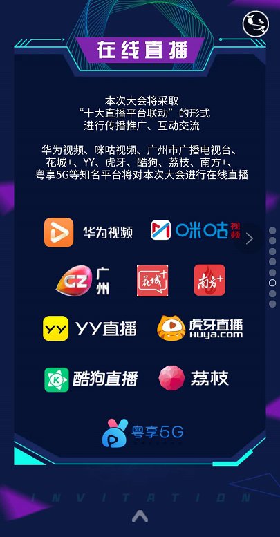 直播平台:华为视频、咪咕视频、广州市广播电视台、花城+、YY、 虎牙、酷狗、荔枝、南方+、粤享5G等知名平台将对本次大会进行在线直播。