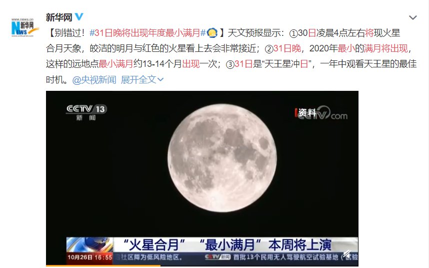 ②31日晚,2020年最小的满月将出现,这样的远地点最小满月约13-14个月出现一次;