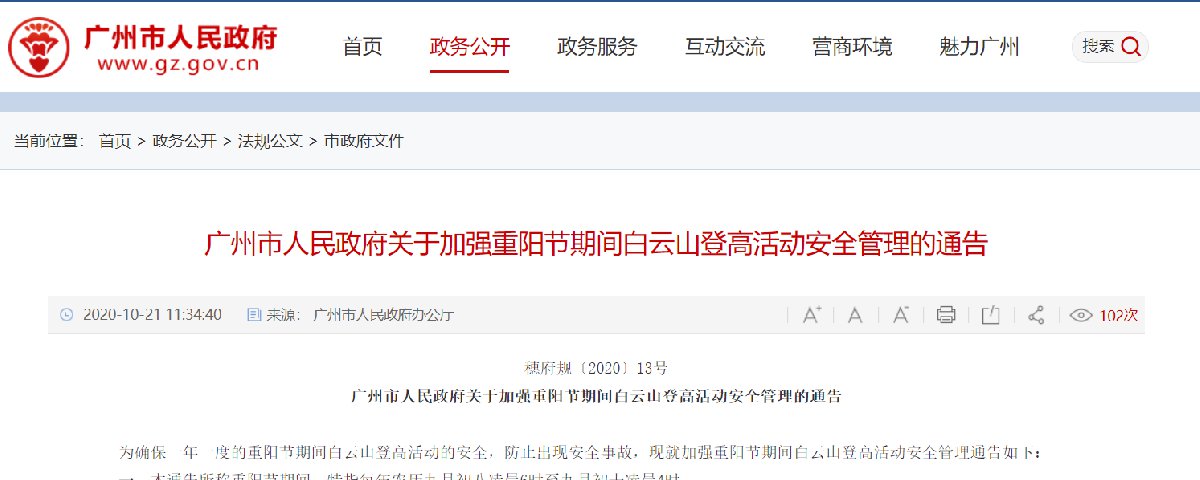 广州市人民政府关于加强重阳节期间白云山登高活动安全管理的通告