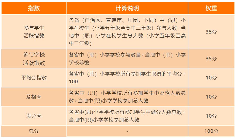 各地总分=参与学生活跃指数×35分+参与学校活跃指数×35分+平均分指数×10分+及格率×10分+满分率×10分。