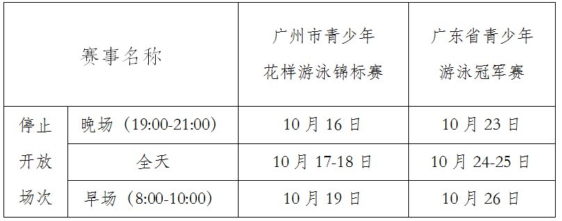 因举办2020年广州市青少年花样游泳锦标赛、2020年广东省青少年游泳冠军赛,天河体育中心游泳馆将于下列时间暂停开放。