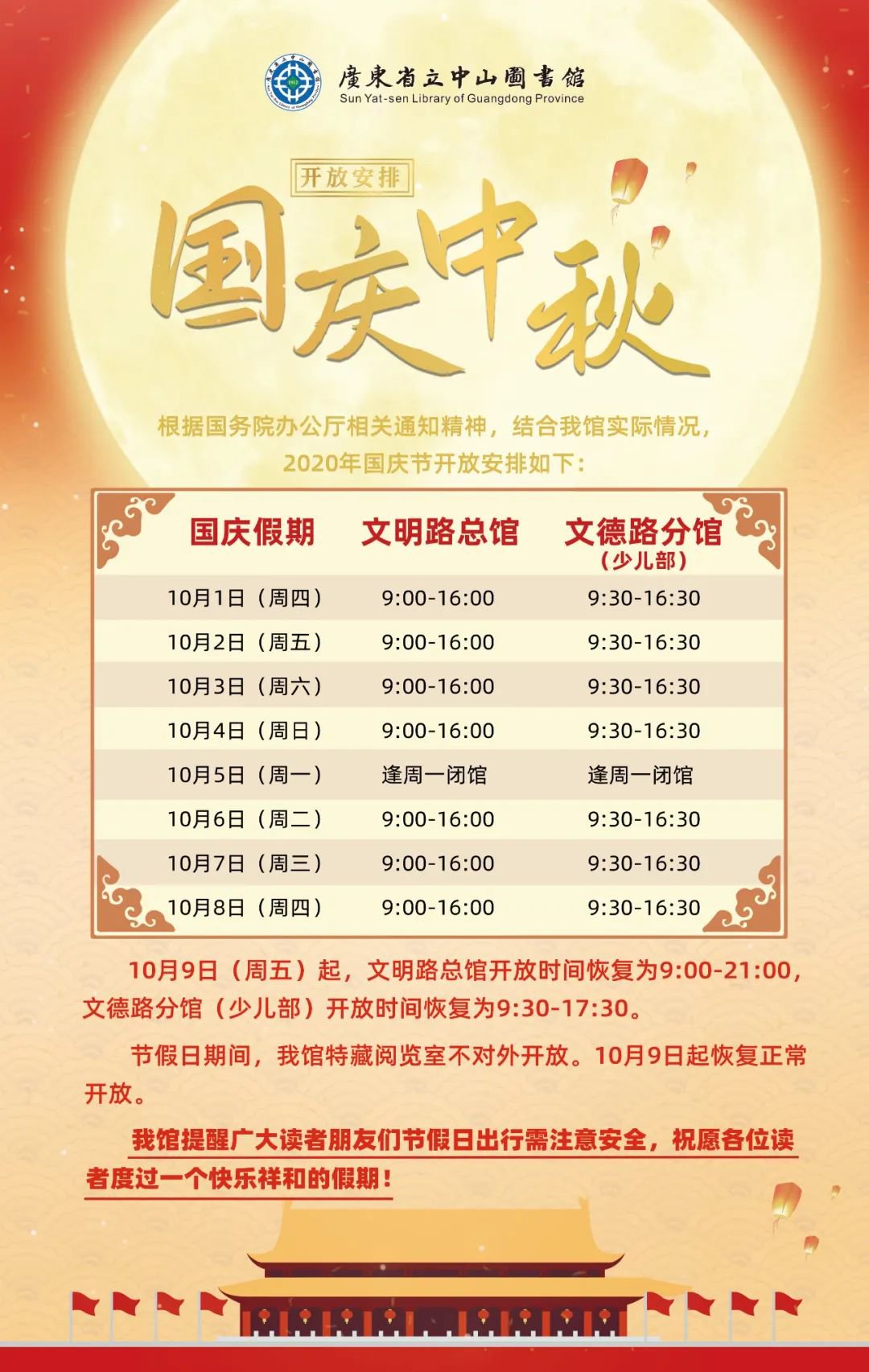 根据国务院办公厅《关于2020年部分节假日安排的通知》,结合目前疫情防控实际,广州图书馆2020年中秋、国庆节期间继续落实适度开放措施,以网络实名分时段预约方式提供服务,开放时间为: