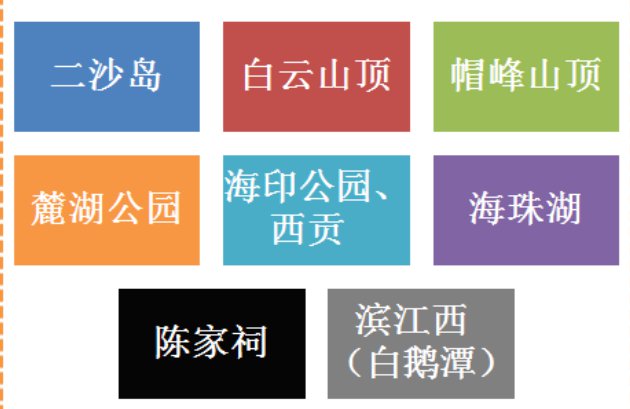 二沙岛、白云山顶、帽峰山顶、麓湖公园、海印公园、西贡、海珠湖、陈家祠、滨江西(白鹅潭)