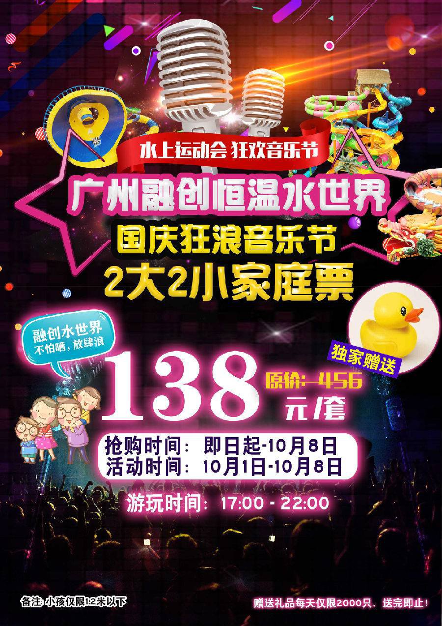 原价458元,现只需138元抢购2大2小广州融创水上嘉年华夜场狂浪音乐节!10.1-10.8齐贺国庆嗨翻天!汇聚流量红人、颠覆盛夏欢乐的国庆制“燥” 狂浪音乐节,室内戏水、放肆ZAO作等您来。