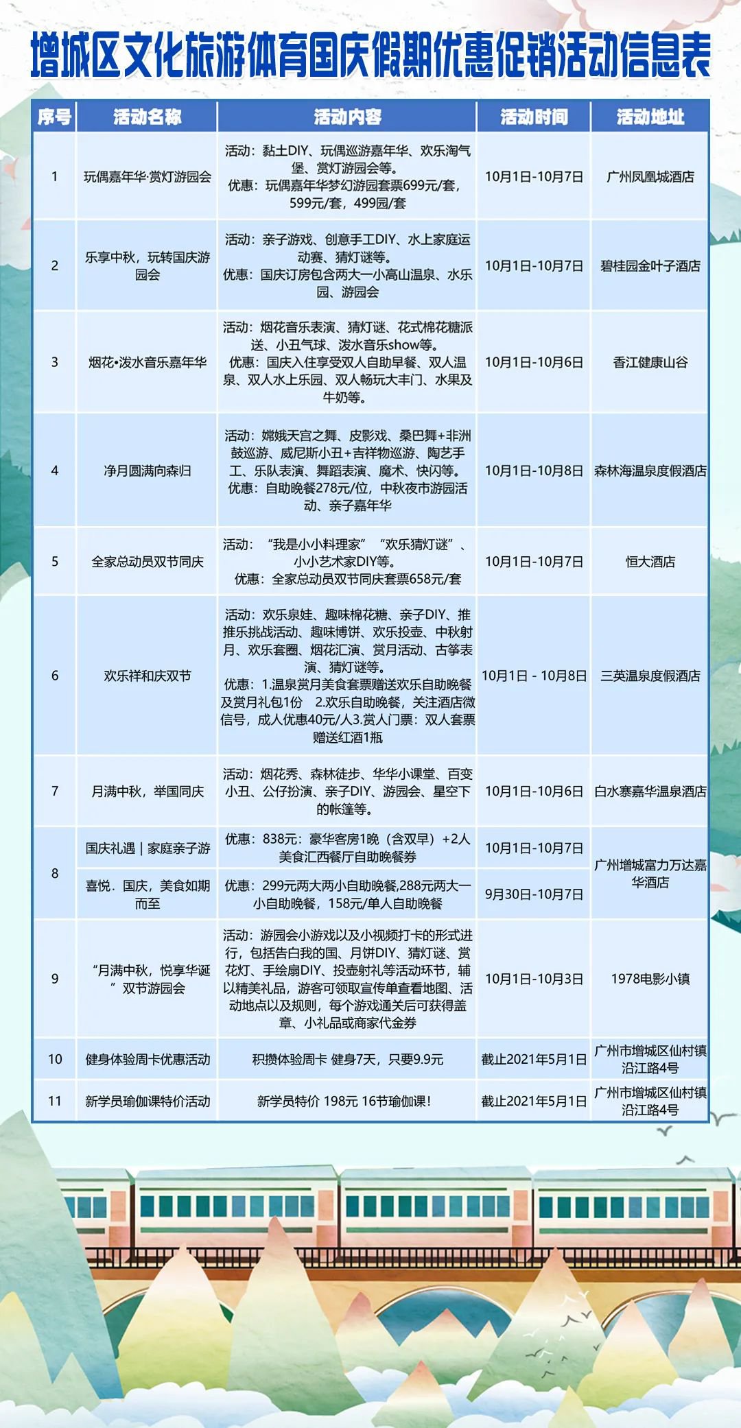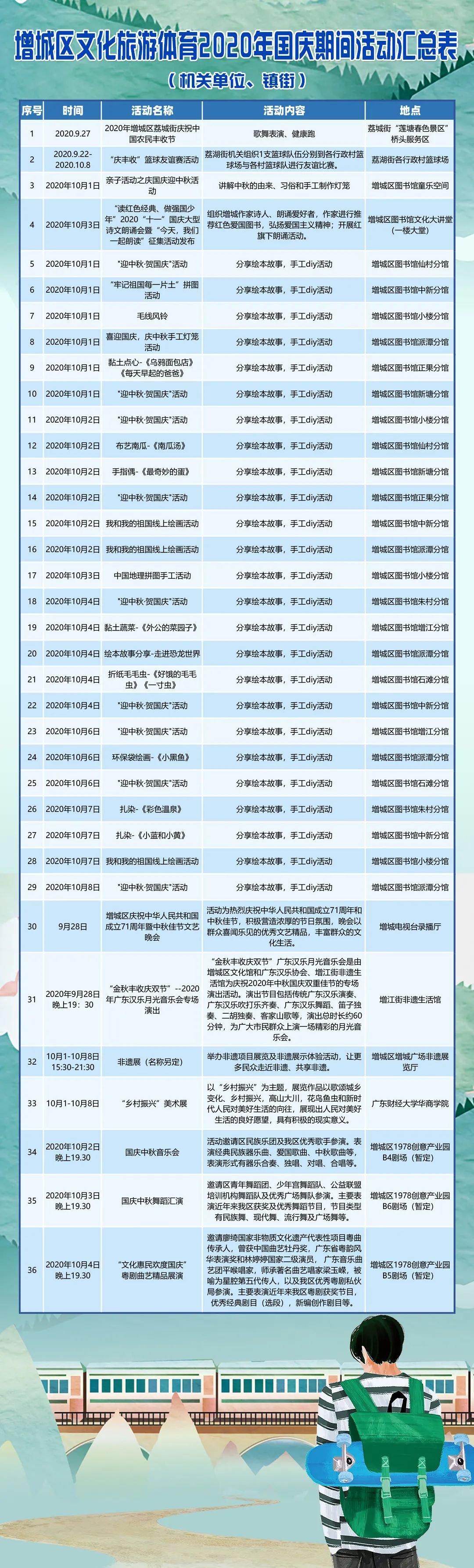 今年国庆中秋“双节”将至,大家准备去哪儿呢?不用远行,留在增城,不间断的精彩文体活动,可以承包你整个假期!增城区将开展文艺晚会、体育赛事、歌舞表演、粤剧汇演、亲子手工、非遗展示等各类文化体育活动,丰富广大市民群众的节日文化生活