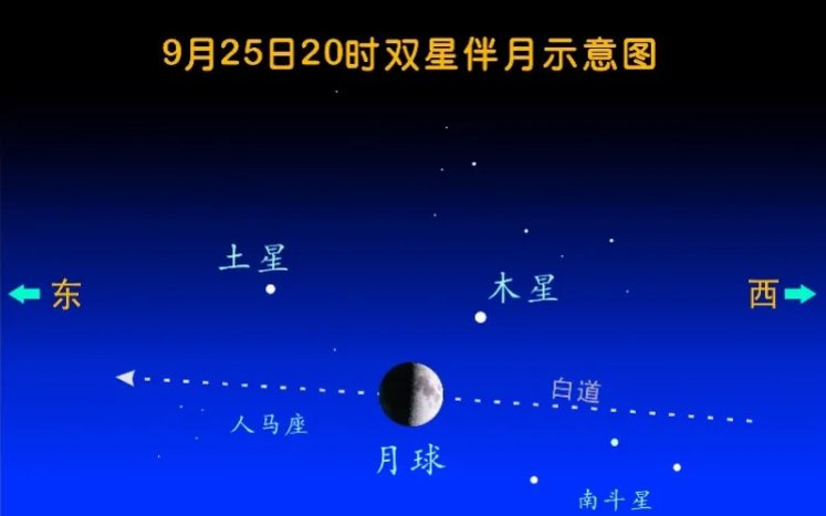 今明两日(9月25日和26日),土星和木星将与一轮盈凸月连续两晚上演“双星伴月”的好戏,在天气晴好的条件下,感兴趣的公众凭借肉眼就可在西南方天空目睹到这幕奇特天象。