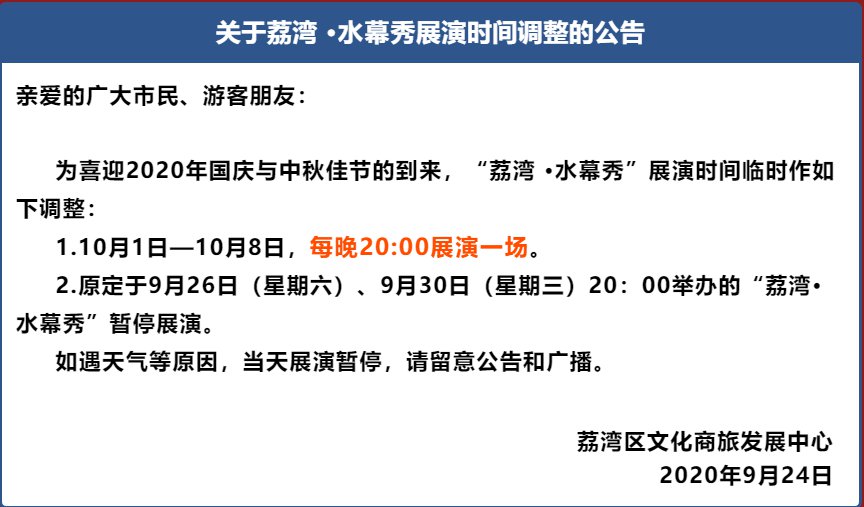 为喜迎2020年国庆与中秋佳节的到来,“荔湾 ·水幕秀”展演时间临时作如下调整: