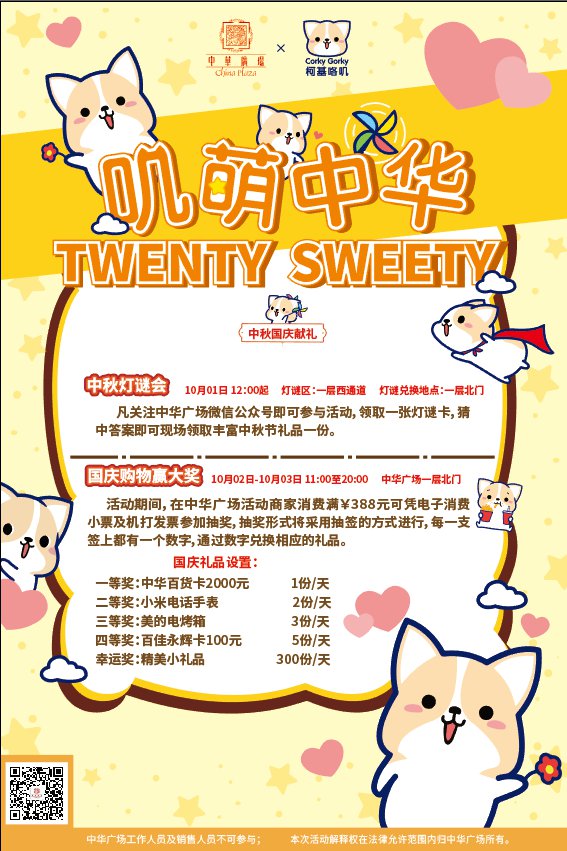 柯基咯叽中秋灯谜会,顾客只需要关注中华广场微信公众号 即可参与一次活动,领取一张灯谜,猜中答案即可现场领取中秋节礼品一份。活动礼品送完即止。