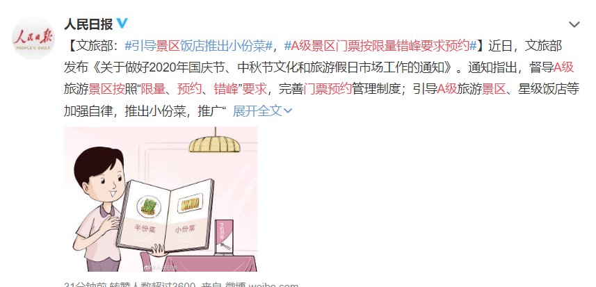 引导景区饭店推出小份菜,A级景区门票按限量错峰要求预约