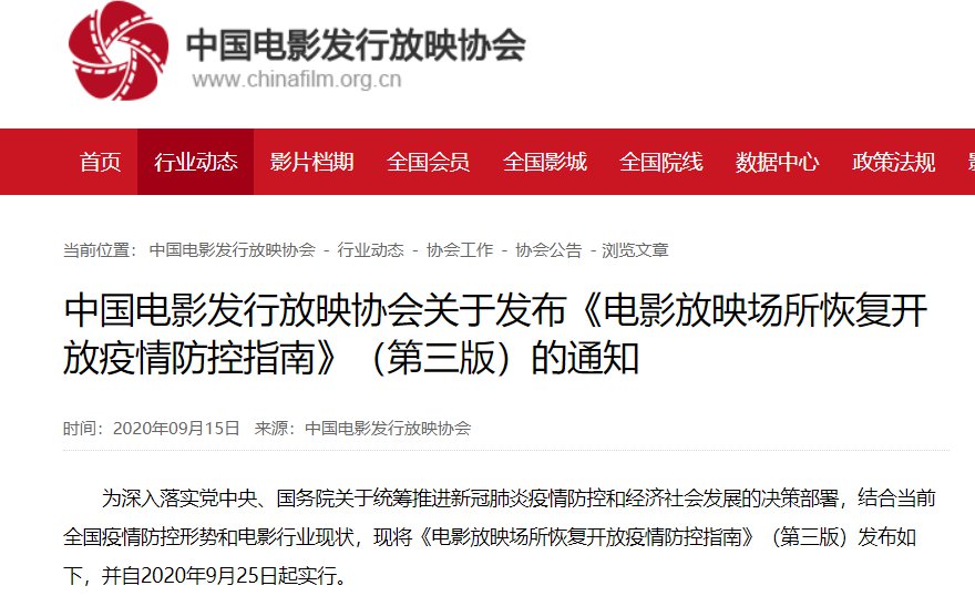 2020年9月25日起电影院上座率提升至75%(附原文)