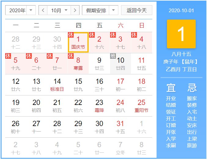 2020年国庆节、中秋节:10月1日 农历 八月十五 星期四