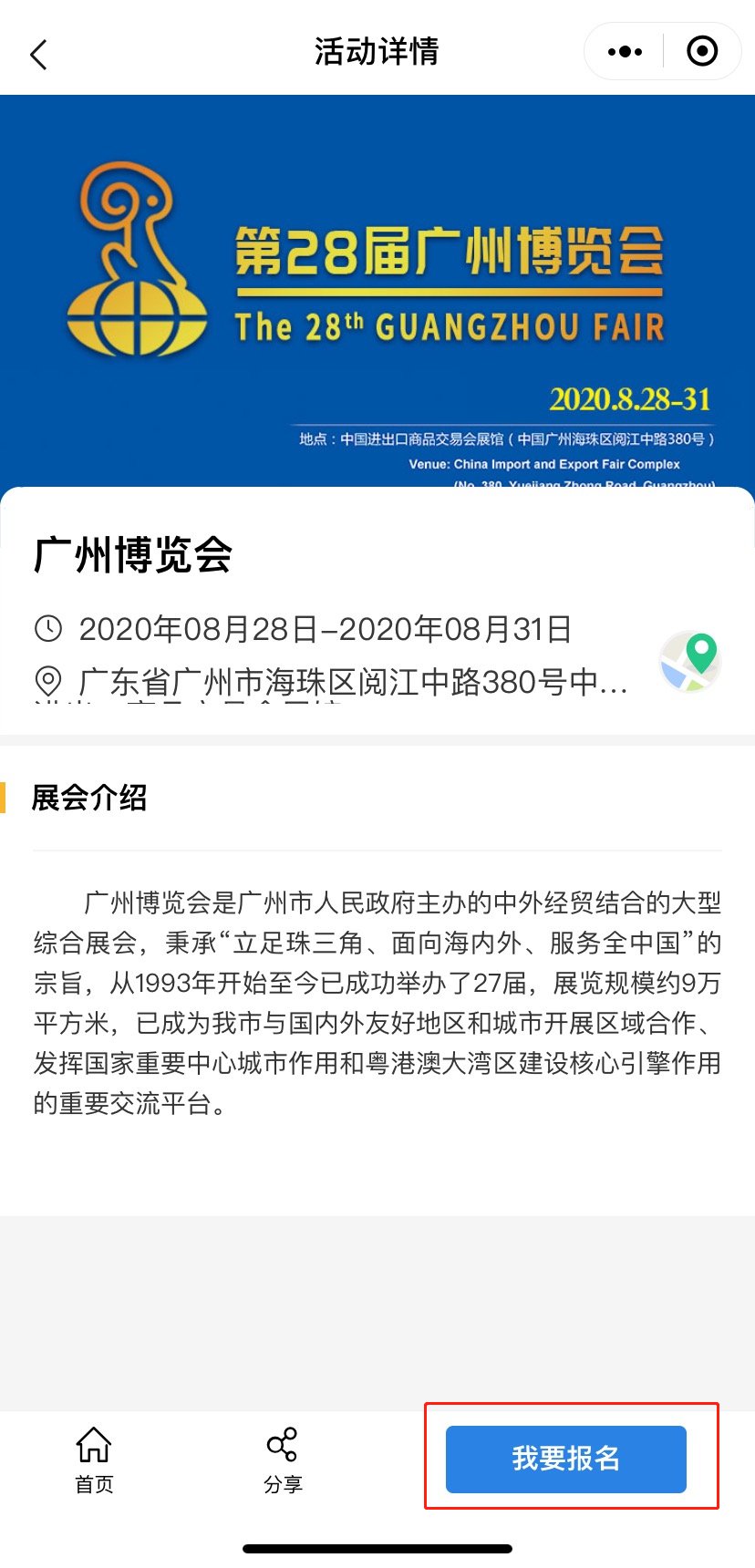 2、点击首页图片,进入活动详情页面点击“我要报名”,填写相关信息,并提交即可完成报名
