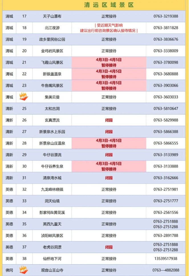1、清远市区景区:新银盏温泉(4A)、太和古洞(3A)、金鸡岩、飞霞山、故乡里(4A)、北江夜游、九道谷漂流、天子山、景泉山庄(温泉、水上乐园)、牛鱼嘴(3A)、玄真漂流(4A)、牛仔谷(温泉、漂流)、清泉湾。