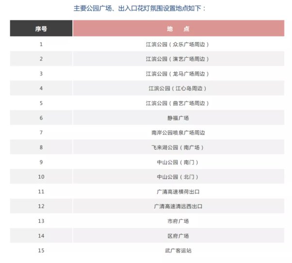 清新区的花灯分别位于:清新区政府、凯逸酒店前、清新公园、凯旋门、城西大道、松林公园东门、清新体育馆、滨矿金五菱前、百步梯。