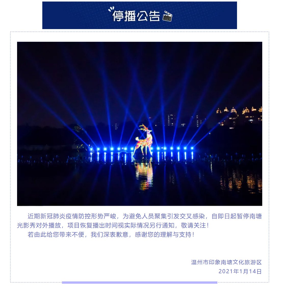 近期新冠肺炎疫情防控形势严峻,为避免人员聚集引发交叉感染,自即日起暂停南塘光影秀对外播放,项目恢复播出时间视实际情况另行通知,敬请关注!