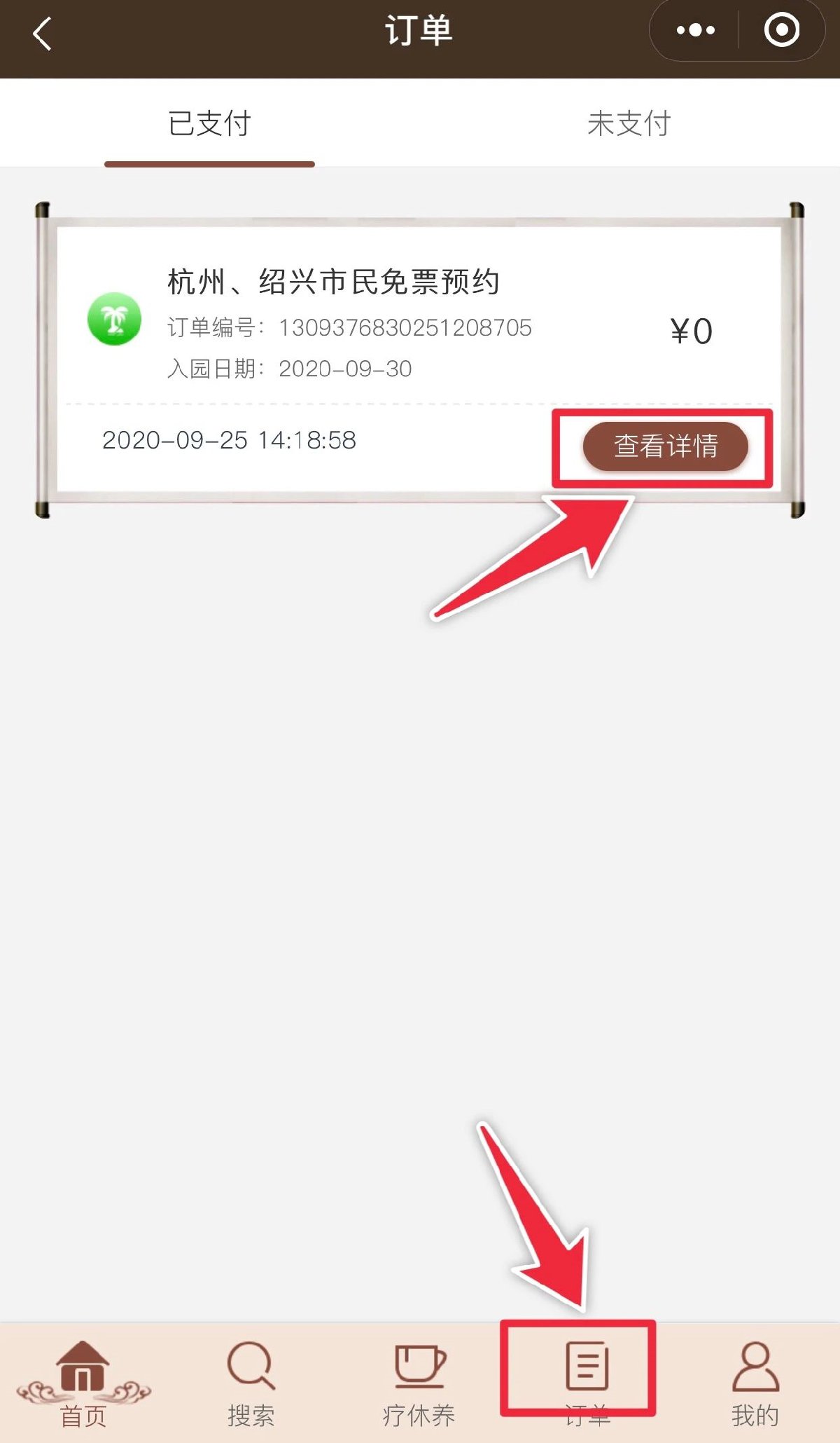 1、游客预约成功后,可在“订单详情”中查看入园二维码。