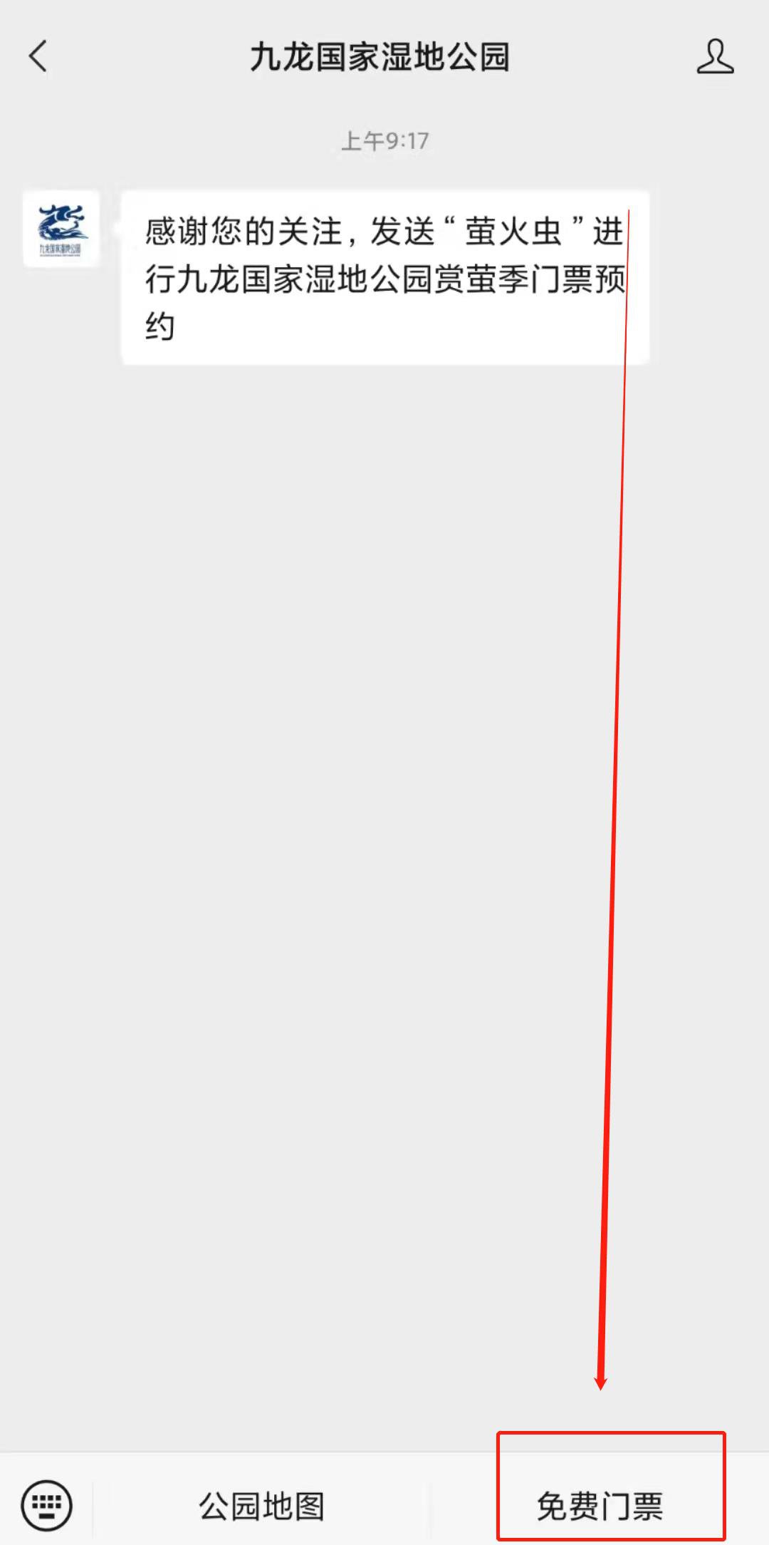 步骤一:关注公众号“九龙国家湿地公园”,进入公众号页面,点击“免费门票”。